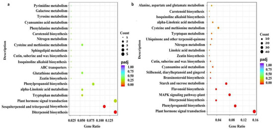 Pathway analysis based on Kyoto encyclopaedia of genes and genomes (KEGG) analysis. (a) The KEGG dot map of differentially expressed genes at 24 h after treatment. (b) The KEGG dot map of differentially expressed genes at 168 h after treatment.
