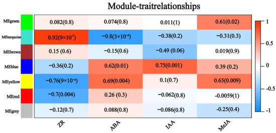 Module-trait associations. Each row corresponds to a module and each column to a trait. Each cell contains the corresponding correlation and p-value.