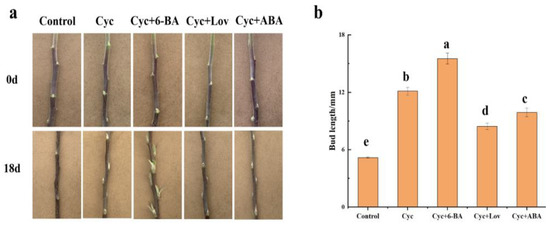 Experiment B: In this, 5 mM (0.5% DMSO) 6-BA, 5 mM (0.5% DMSO) lovastatin, and 0.02 mM (0.5% DMSO) ABA were supplied 1 day after 0.2 g/L (0.5% DMSO) CYC treatment. The treatments with 0.2 mM (0.5% DMSO) CYC and only 0.5% DMSO represented positive and negative controls, respectively. Each treatment consisted of 12 stocks. The bud length was measured after 18 days after the treatment using a digital calliper.