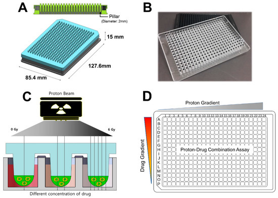Various HTS technologies using 3D spheroid-based multiwell pillars have been developed to determine therapeutic responses in cancer [25]. We utilized this technology to develop a new system for concomitantly measuring the combined effects of proton radiation and anticancer drugs. For this, we adopted the 384-pillar/well platform (Figure 1A,B), which was proven to be suitable for drug screening under 3D culture conditions [25]. Proton beams with a spread-out Bragg peak (SOBP) of 30 mm width were perpendicularly delivered to the 384-pillar/well plate (Figure 1C). The plate was mapped to have a layout that increased the proton dose in the transverse direction and the drug dose in the longitudinal direction for evaluating proton–drug combinations (Figure 1D).