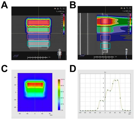 Dose distribution of the 4-step cell irradiation plan. Homogeneous dose distributions were achieved by each plateau, and delivered doses decreased in a stepwise manner. (A) Coronal view; (B) sagittal view. (C) Delivered doses were measured by 2D ion chamber array. (D) One-dimensional dose distribution of plan and measurement were plotted. The measured dose points were spaced at 1 cm intervals, and are denoted as dots. The solid line indicates the plan dose.