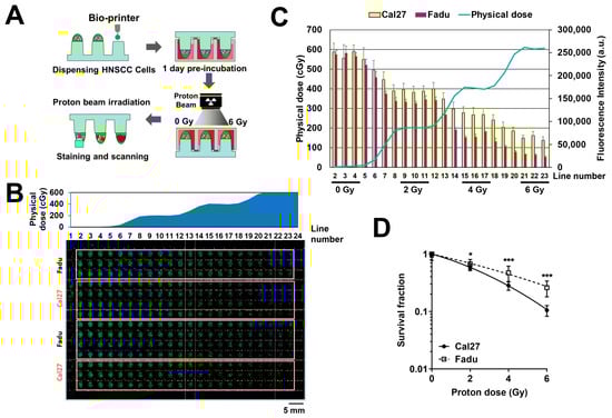 Next, we evaluated whether the 3D-based HTS platform measured the dose-dependent sensitivity of HNSCC cells to proton irradiation. Fadu and Cal27 cells were suspended in a matrix consisting of 0.5% alginate and 50% Matrigel, and the mixture was automatically spotted on top of the pillars (Figure 3A). After 1 day of preincubation, the pillar/well plates were irradiated with proton beams using the prescribed treatment plan. After 7 days of incubation, the spheroids were stained with Calcein AM, a membrane-permeable live-cell labelling dye. Fluorescent images of the spheroids stained with Calcein AM in an entire 384-well plate showed that green fluorescence signals decreased with an increasing proton dose from left to right (Figure 3B). Quantitative data confirmed that fluorescence intensity was inversely correlated with the physical dose (Figure 3C). Data were acquired from flat areas with proton doses of 0, 2, 4, and 6 Gy, which corresponded to three consecutive rows (Figure 3C). Dose–response curves showed that Fadu cells were more radioresistant to Cal27 under 3D-culture conditions (Figure 3D).