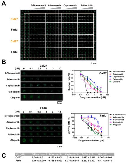 We utilized the 3D-based HTS platform to determine the sensitivity of the two HNSCC cell lines to various anticancer drugs. Spheroids of Fadu and Cal27 cells were allowed to grow onto 384 pillars and were then exposed to five anticancer drugs at a concentration of 0 to 10 µM for 7 days. The dose–response curves and IC50 values were calculated from the fluorescence intensity values of the scanned images. Scanned images of spheroids treated with each drug showed a dose-dependent decrease in the number of Calcein-AM-stained spheroids (Figure 4A). In addition, 5-fluorouracil, a chemotherapeutic drug for HNSCC, dramatically decreased the viability of spheroids of both Fadu and Cal27 (IC50 = 0.168 and 0.044, respectively; Figure 4B,C). Compared with Fadu, Cal27 spheroids were more sensitive to other anticancer drugs, including adavosertib (Wee1 inhibitor), capivasertib (AKT inhibitor), and palbociclib (CDK4/6 inhibitor), but not olaparib (PARP inhibitor). These data suggested that our 3D-based HTS platform was useful for comparing the effects of multiple anticancer drugs on spheroid growth, as well as proton beams, in a quantitative manner.