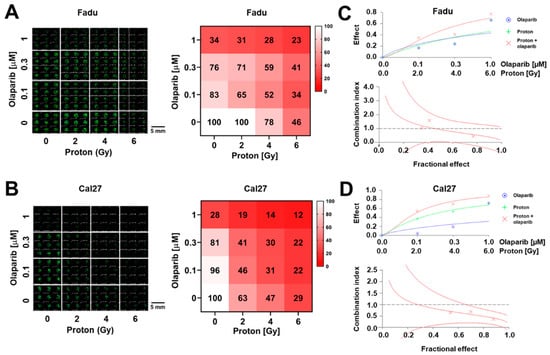 Olaparib is a well-known radiosensitizer in many types of cancers, including HNSCC. To confirm the utility of the 3D-based HTS platform for proton sensitizer screening, we tested the combined effects of protons and olaparib. Spheroids of Fadu and Cal27 were allowed to grow onto 384 pillars for a day, followed by treatment with olaparib and protons on the same day. After 7 days of incubation, the spheroids were stained with Calcein AM. Scanned fluorescence images showed that the number of Calcein-stained spheroids of both Fadu and Cal27 decreased with increasing doses of olaparib and protons (Figure 5A,B, right). The scanned image was converted into a 4 × 4 matrix of survival rates; each element represented the relative survival rates calculated from the averaged fluorescence intensity of spheroids grown under the indicated treatment conditions (Figure 5A,B, left). Analyses of the survival data matrix showed that olaparib had a synergistic effect with protons in both HNSCC spheroids, which was judged by calculation of the combination index (CI) using CalcuSyn software; the synergism was more evident in Cal27 than Fadu (Figure 5C,D). We also tested another combination of protons and adavosertib in both Fadu and Cal27 spheroids, and found that there was no additive effect (Figure S1).