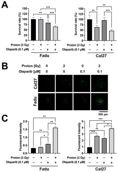 Effect of combination treatment with proton and olaparib on the apoptosis of HNSCC spheroids. (A) Comparison of survival rates of Fadu and Cal27 treated with 2 Gy of proton and 0.1 µM olaparib. Data are mean ± S.D. (n = 9). (B) Apoptotic cell death induced by the combination treatment with protons and olaparib as determined by caspase-3/7 detection assay. Representative fluorescent images of Cal27 and Fadu spheroids related to caspase-3/7 activity. (C) Quantification of fluorescence intensity showing an increase in apoptotic death of spheroids by the combination with proton and olaparib. Data are mean ± S.D. (n = 3). * p < 0.05; ** p < 0.01; *** p < 0.001.