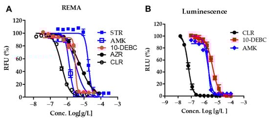 In vitro activity of 10-DEBC. (A) The activity of 10-DEBC against M. abscessus in MH broth medium. DRC was plotted from the REMA. RFU, relative fluorescence units. (B) The activity of 10-DEBC against M. abscessus-Lux, incubated under the same condition as in panel B RLU, relative luciferase units. The experiments were carried out with three biological replicates and expressed as the mean ± SEM for each concentration.