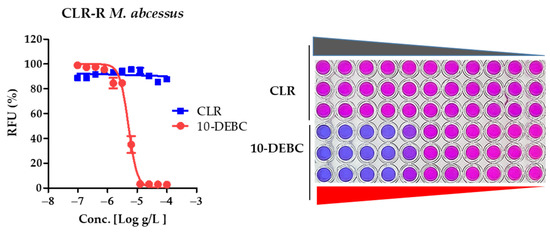 As can be seen in Figure 4, CLR has excellent bactericidal activity (IC50 = 0.034 μg/mL) in growing culture but lost its activity ultimately against biofilm-growing M. abscessus (IC50 > 200 μg/mL). On the other side, 10-DEBC still has an IC50 of 38.72 μg/mL and MIC90 of 50 μg/mL against biofilm-growing bacteria. It seems to be active against M. abscessus that grows on biofilms. These results suggest 10-DEBC is an attractive substance for all types of anti-M. abscessus treatment.
