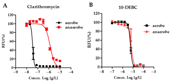 DRC of 10-DEBC. DRC of M. abscessus under aerobic, anaerobic using REMA. M. abscessus was undergone for seven days within an anaerobic generating container system (BD GasPak™ EZ). The activity of CLR (A) and 10-DEBC (B) against M. abscessus under aerobic and anaerobic conditions. The experiments were carried out with three biological replicates and expressed as the mean ± SEM for each concentration.