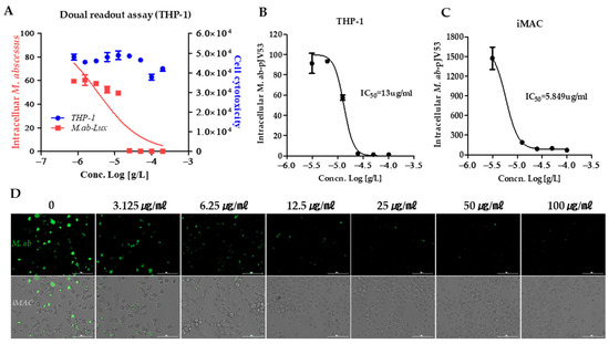 The dual reading test made it possible to obtain DRC for M. abscessus inhibition and cytotoxicity of THP1 cells [29]. IC50 and CC50 can be defined (cell toxicity concentration that induces 50% cell death) in this study. Figure 5 shows the dual DRC to 10-DEBC and the data obtained from the same screening wells over time. Cytotoxicity was measured with the SYTO 60 probe. Treatment with CLR successfully rescued cells from infection challenge and prevented bacterial replication (data not shown). Kim et al. showed that CLR significantly reduced the intracellular M. abscessus present two days after infection at concentrations of 0.1 μg/mL [30]. 10-DEBC inhibited the growth of M. abscessus (lux) in a dual read assay with an IC50 of 3.48 μg/mL, with no cytotoxicity for THP1, even at the highest concentrations (Figure 5A). Consistently with the THP-1 infection model, the intracellular inhibitory activity of 10-DEBC was shown (Figure 5B). 10-DEBC was found to inhibit the intracellular growth of M. abscessus in THP-1 cells with an IC50 of 13.18 μg/mL (Figure 5B), while inhibiting replication of M. abscessus inside human embryonic cell-derived macrophages (iMACs) with an IC50 of 5.8 μg/mL, without host cell toxicity even at the highest concentration of 50 μg/mL (Figure 5C,D).