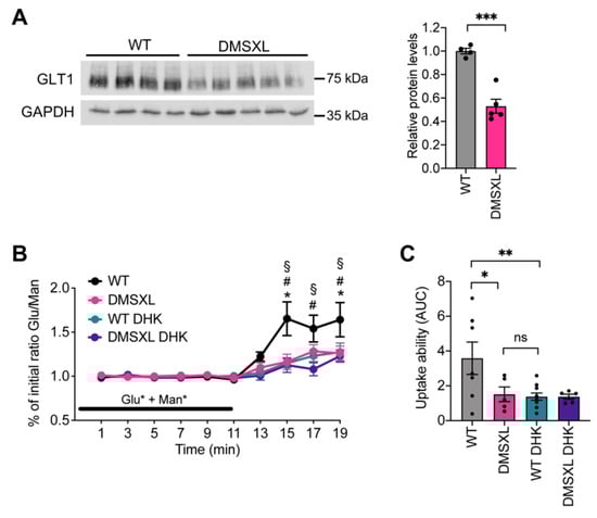 We first investigated GLT1 protein levels in the whole hippocampus of DMSXL mice and the impact on glutamate uptake and extracellular levels. Western blot quantification of GLT1 steady-state levels revealed a significant decrease in the glial glutamate transporter by 50% (p < 0.001) (Figure 1A). Glutamate uptake ability was challenged by administrating exogenous glutamate [,], simultaneously to nonmetabolizable mannitol [] as previously described [] (Supplementary Figure S1). The ratio between the two radio-labelled molecules increased during the wash-out period, peaking 4–6 min after the end of isotopic infusion (Figure 1B). Lower glutamate/mannose ratios were found in DMSXL animals, when compared with WT controls, suggestive of defective glutamate uptake ability in the hippocampus, as previously shown in the frontal cortex, another brain region very relevant for DM1 neuropsychological manifestations []. To confirm that the DMSXL traces were indicative of decreased glutamate uptake in the hippocampus, we administered an uptake blocker (dihydrokainate, DHK) concomitantly with the two radio-labelled molecules and measured the glutamate/mannose ratio during the perfusion and wash-out periods. As expected, the unspecific blockade of the glial transporters by DHK decreased the wash-out glutamate/mannose ratio in WT mice to levels that were undistinguishable from those found in the DMSXL hippocampus (Figure 1B). We used the area under the curve (AUC) during the wash-out period as an estimate of glutamate uptake ability in the different mouse groups [] and confirmed that glutamate uptake was significantly reduced in the DMSXL hippocampus relative to WT controls (Figure 1C).