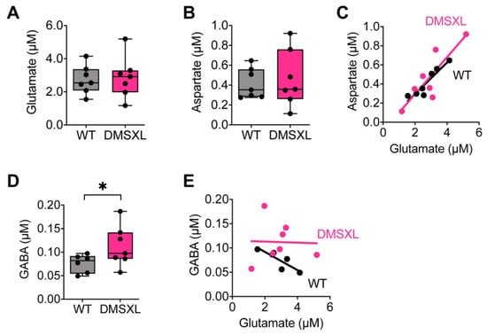 We then determined the net extracellular concentration of glutamate in DMSXL mice, using quantitative microdialysis in vivo, as recently described []. Notwithstanding the reduced glutamate uptake found in the DMSXL hippocampus, the overall extracellular concentration of glutamate remained unaltered, compared with WT controls (Figure 2A). Similarly, we did not find significant changes in the global extracellular levels of aspartate, another excitatory amino acid taken by the glutamate GLT1 uptake system of glial cells (Figure 2B). The extracellular levels of these two excitatory neurotransmitters were positively correlated in the hippocampus of both genotypes: higher levels of glutamate were associated with higher concentrations of aspartate in individual animals (Figure 2C). We also investigated the extracellular concentration of the inhibitory neurotransmitter GABA and found a surprising increase in DMSXL mice relative to WT controls (DMSXL, 0.112 ± 0.016 µM; WT, 0.076 ± 0.008 µM; p = 0.040) (Figure 2D). Importantly, while GABA concentration in individual WT mice was negatively correlated with the levels of glutamate, the correlation was lost in the DMSXL hippocampus (Figure 2E), suggesting a disequilibrium between excitatory and inhibitory neurotransmitters.