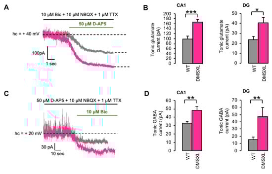 In vivo microdialysis is capable of quantifying global extracellular glutamate levels, which are the net result from the combination of neurotransmitter release and uptake by neurons and glial cells [] at the level of a whole tissue. The overall concentration measured by microdialysis (Supplementary Figure S1) may then differ from the ambient extracellular glutamate levels present in the synaptic cleft and extrasynaptically, which can activate membrane receptors. Therefore, we investigated ambient glutamate indirectly by the recording of tonically activated glutamate NMDA receptors (NMDARs) in the hippocampus using whole-cell patch clamp recordings of CA1 (cornu ammonis 1) and DG (dentate gyrus) neurons. For that purpose, the holding current necessary to maintain the recorded cells at +40 mV was measured in the presence of an inhibitor cocktail (see methods) that spares NMDARs (Figure 3A). At this potential, NMDARs are relieved from their Mg2+ block and potentially activable by residual glutamate in the synaptic cleft and away, therefore generating a NMDAR-dependent tonic current []. The mean tonic current amplitude measured after the action of the selective NMDAR antagonist D-AP5 was significantly higher in the CA1 area of DMSXL than in WT mice (DMSXL, 166.8 ± 10.7 pA; WT, 98.8 ± 11.8 pA; p = 0.0002). In DG, the amplitude of the tonic current was smaller than in CA1 for both genotypes, but still significantly higher in DMSXL when compared with WT mice (DMSXL, 40.8 ± 5.1 pA; WT 23.6 ± 3.3; p = 0.012) (Figure 3B).