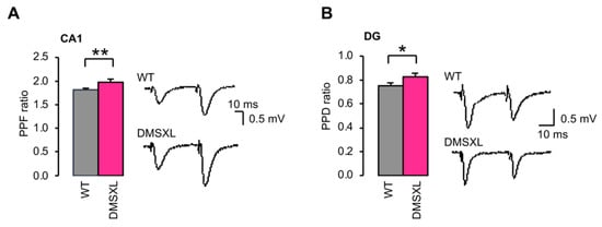 Short-term plasticity in CA1 and DG. (A) PPF in CA1. For PPF measurement, the slope of the second response was normalized by the slope of the first one. The PPF ratio was significantly higher in slices from DMSXL mice (n = 24 mice, n = 55 slices) than in WT controls (n = 24 mice, n = 58 slices). ** p = 0.006. (B) PPD in DG. The PPD ratio was significantly increased in DG slices from DMSXL mice (n = 7 mice, n = 23 slices) relative to WT animals (n = 9 mice, n = 29 slices). * p = 0.038.