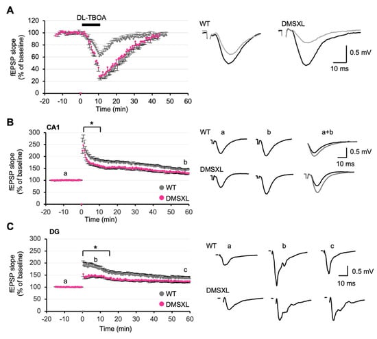 Long-term synaptic plasticity in the DMSXL hippocampus. (A) Effects of the inhibitor of glutamate transporter DL-TBOA on fEPSPs. DL-TBOA, applied for 10 min at 40 µM, induced a strong depression of the synaptic transmission in DG of both DMSXL (n = 4 mice, n = 8 slices) and WT mice (n = 5 mice; n = 9 slices). The effect was significantly stronger in DMSXL mice, ** p = 0.002. Right, sample traces of recordings before (black) and 20 min after TBOA application (grey) are shown. (B) LTP in CA1. The time course of LTP following a 3 × 100 Hz stimulation was significantly decreased in hippocampal slices from DMSXL mice (n = 9 mice; n = 19 slices) as compared with WT controls (n = 9 mice; n = 19 slices), * p = 0.022. The potentiation measured 60 min after stimulation was not different between genotypes, p = 0.1. Examples of fEPSP recordings during the baseline (a) and 60 min after induction of LTP (b) are shown on the right. (C) LTP in DG. LTP induced by a 2 × 100 Hz stimulus was significantly decreased in DMSXL mice (n = 7 mice; n = 12 slices) during the early phase postinduction (first 15 min following stimulation) compared with WT (n = 6 mice; n = 15 slices). *p = 0.019. The mean LTP magnitude during the last 15 min of the recordings was comparable between genotypes, p = 0.17. The overall time course of LTP was significantly different in DMSXL mice, *p = 0.047. On the right, individual traces of fEPSPs are shown in the three conditions: before (a), 10 min after stimulation (b), and 60 min after stimulation (c).