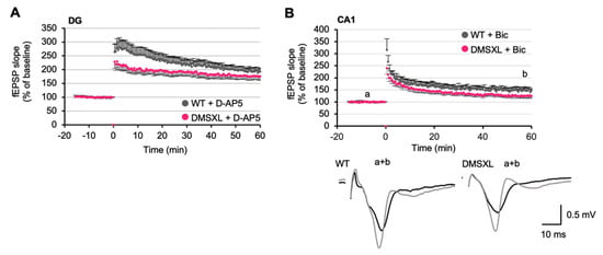 Appropriate glutamate concentration in the synaptic cleft is required for hippocampal LTP induction. We therefore tested whether the LTP impairment in DG of DMSXL mice could be attributed to local glutamate elevation and tonic NMDAR activation. To this end, we applied a low dose of the selective NMDAR antagonist D-AP5, as previously described []. Under these conditions, 1 µM D-AP5 did not restore the abnormal LTP of DMSXL mice to WT levels, and the time course of LTP remained statistically different between animal groups (p = 0.039) (Figure 6A). Together with the lack of changes in the NMDA-dependent fEPSP/PFV ratio recorded in DMSXL mice (Supplementary Figure S5), these data indicate that the altered synaptic potentiation of DMSXL mice may not be attributed to an inappropriate NMDA receptor activity. Since an elevation of extracellular GABA concentration was found in the DMSXL hippocampus, we performed additional studies in the presence of bicuculline (4 µM Bic) to investigate whether this GABAA receptor antagonist could restore LTP in DMSXL mice. In CA1, the LTP measured over the last 10 min was still slightly lower in DMSXL mice (126.0 ± 8.5%) than in WT controls (148.2 ± 11.1%), but the difference was not statistically significant. However, the overall time course of LTP was statistically different between mouse genotypes (p < 0.05) (Figure 6B). The difference in LTP time course between DMSXL and WT mice under these conditions was comparable to the difference found in the absence of Bic (Figure 5B). Therefore, Bic did not reinstate a normal time course of LTP in the hippocampus of DMSXL mice, arguing against a contribution of elevated GABA level in LTP changes.