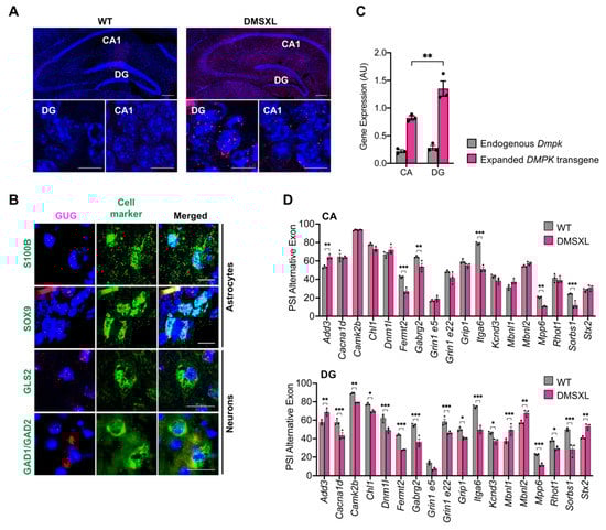 RNA foci accumulation and spliceopathy in the DMSXL hippocampus. (A) FISH analysis of nuclear foci accumulation in the hippocampus of WT and DMSXL mice. The DMSXL hippocampus shows greater foci content in DG compared with CA1 at 1 month of age. Scale bar a lower magnification, 200 µm. Scale bar a higher magnification, 50 µM. (B) FISH of RNA foci (magenta) combined with IF detection of astrocyte (S100B or SOX9), glutamatergic (GLS2), and GABAergic (GAD1/GAD2) protein markers (green). Nuclei were stained with DAPI (blue). Scale bar, 10 µm. (C) Expression of human DMPK transgene and mouse endogenous Dmpk gene relative to Polr2a internal control in CA and DG areas of the DMSXL hippocampus at 1 month of age. ** p = 0.0022. (D) Splicing dysregulation in the CA and DG areas of the DMSXL hippocampus at 1 month of age (n = 3 mice per genotype). The graphs represent the PSI (percentage of splicing inclusion) of alternative exons. * p < 0.05, ** p < 0.001, *** p < 0.001 (two-way ANOVA, Sidak post hoc test for multiple comparisons).