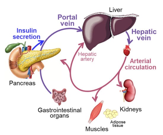 Insulin is produced by pancreatic β cells and secreted into the portal vein, which delivers the newly produced insulin to the liver. The liver extracts approximately half or more of the newly secreted insulin [10,11,12]; the remaining insulin leaves the liver via the hepatic veins and enters the systemic arterial circulation (Figure 1). Under basal conditions, the kidneys extract approximately 30–35% of the insulin that is delivered, and skeletal muscles and adipose tissue extract approximately 15% [12,13,14,15,16,17]. Insulin that is not extracted during the first pass through tissues is removed in subsequent passes. Total insulin delivery to the liver therefore represents the sum of insulin secretion and insulin delivery from the systemic circulation back to the liver through both the hepatic artery and the portal vein (after passage through the gastrointestinal tract) [18]. In total (first and subsequent passes), the liver takes up approximately 65% of the amount of insulin that has been secreted; the kidneys take up approximately 25% of the total amount secreted and skeletal muscles and other tissues and organs take up approximately 10%. The removal of insulin from the circulation is very efficient, because of the high extraction of insulin by the liver and kidneys. The mean residence time of insulin in the circulation is only a few (<10) minutes [19,20,21,22,23,24,25]. Nevertheless, very small differences in insulin clearance can have a major impact on plasma insulin concentration because the insulin secretion rate is very high in relation to the plasma insulin pool size [26]. Assuming average basal insulin secretion and clearance rates in people with obesity [8,27], a 10% decrease in plasma insulin clearance would cause a ~120 pmol/L (or ~20 mU/L) increase (approximately doubling of basal values) in plasma insulin concentration in just 10 min. Understanding the regulation of insulin removal from plasma and how it might be altered in people with obesity and T2D is therefore very important.