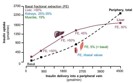Highly sophisticated studies that included arterio-venous blood sampling across various tissues and organs after administering insulin, or after stimulating endogenous insulin secretion, have demonstrated that the fractional extraction of insulin by tissues varies among tissues and is dependent on the insulin delivery rate [12,13,14,15,16,69,70,71] (Figure 3). During basal conditions, liver extracts >50% of the insulin that is delivered, kidneys extract ~30% and skeletal muscles extract approximately 15–35% [12,13,15,16]. When insulin delivery to the liver and muscles increases, insulin uptake (pmol/min) increases, but the fractional extraction of insulin by these tissues (percent delivered that is taken up) and plasma insulin clearance rate decrease [12,13]. Insulin clearance in the kidneys on the other hand is unaffected by increased insulin delivery or even increases with increasing insulin delivery [12,16], presumably because the bulk of insulin in the kidneys is removed by glomerular filtration and reabsorption via simple diffusion [42,43]. Increased renal insulin clearance can therefore compensate to some extent for the decrease in insulin clearance in liver and muscles.