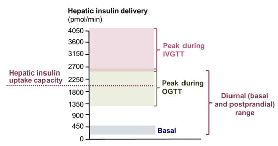 Throughout the day, the insulin secretion rate from pancreatic β cells into the portal vein ranges from <200 pmol/min after an overnight fast in lean people to peak values of approximately 800 pmol/min postprandially in people with obesity and insulin resistance [76,77]. Arterial plasma insulin concentration is as low as <60 pmol/L in lean people after an overnight fast and can reach values of up to ~1000 pmol/L in people with obesity postprandially [76,77,97]. Total hepatic insulin delivery (insulin secretion rate plus insulin that is returned to the liver from the systemic circulation) ranges from <300 pmol/min to peak values of approximately 2000 pmol/min [18,95]. During oral glucose tolerance and meal tests, insulin secretion rate rises gradually during the first one to two hours and then starts to decrease towards basal values [3,8,95,98]. Insulin secretion and total hepatic insulin delivery rates during oral glucose challenge tests with up to 75 g of glucose [3,70,98,99] are similar to those observed after meal intake [76,77]. During an intravenous glucose tolerance test, on the other hand, the insulin secretion rate increases almost instantaneously to peak values (≥2000 pmol/min) [98,99,100,101] that far exceeds peak postprandial insulin secretion [76,77] and reaches or exceeds the hepatic capacity for insulin uptake [12] (see Section 1.5. Effect of insulin dose on insulin removal by tissues in vivo). The amount of glucose infused during a hyperglycemic clamp procedure can also elicit an insulin secretion rate and total hepatic insulin delivery rate (insulin secretion rate plus insulin that is returned to the liver from the systemic circulation) that well exceeds the hepatic capacity for insulin uptake [12,74,102].