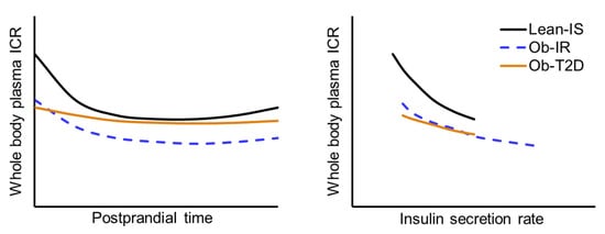 Effect of obesity, insulin resistance, and type 2 diabetes on basal and postprandial plasma insulin clearance rate. Left panel: Whole-body plasma insulin clearance rate during basal conditions and for three hours after glucose ingestion. Right panel: Plasma insulin clearance rate in relationship to insulin delivery to tissues during basal conditions and during the early postprandial period. Adapted from references [3,8,83]. Abbreviations: ICR, insulin clearance rate; IS, insulin sensitive; IR, insulin resistant; Ob, obese; T2D, type 2 diabetes.