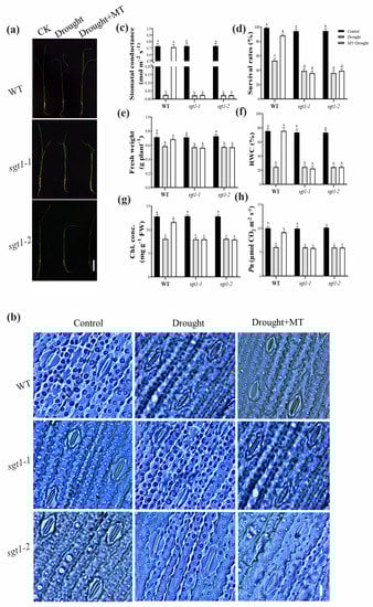 Drought stress usually inhibits seedling growth and disrupts photosynthesis and physiological metabolism. Melatonin has been reported to mitigate the adverse effects of drought stress on seedlings [,]. To determine whether the OsSGT1 mutation affected the mitigating effects of melatonin on seedlings’ growth under drought stress, plant phenotypes, stomatal aperture, survival rates, plants height, fresh weight, relative water contents (RWC), chlorophyll (Chl.) contents and photosynthetic rates (Pn) were investigated in WT and sgt1 mutants. Drought stress conditions led to the inhibited seedlings growth (Figure 1a), closure of stoma (Figure 1b), and lower stomatal conductance (Figure 1c), and also significantly decreased the entire investigated index (Figure 1d–h; Figure S3), both in WT and sgt1. Significantly, compared with the control, the survival rates were decreased by 46.12% and 59.3% in WT and sgt1, respectively (Figure 1d), while RWC were reduced by 67.28% and 66.76% in WT and sgt1, respectively (Figure 1f). Moreover, the contents of chlorophylls and the photosynthetic rates under drought stress were significantly lower than control (Figure 1g,h). These results suggested that the seedling growth was greatly suppressed under drought stress.