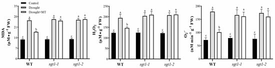 Effects of melatonin treatments on oxidative damages under drought stress. Contents of hydrogen peroxide (H2O2) and malondialdehyde (MDA), and superoxide (O2−) production rates, were examined in the leaves of wild-type (WT) and sgt1 mutant seedlings treated with melatonin (MT; 100 μM) under drought stress. Difference in letters indicates significant differences according to Tukey’s Multiple Comparison Test (p < 0.05).