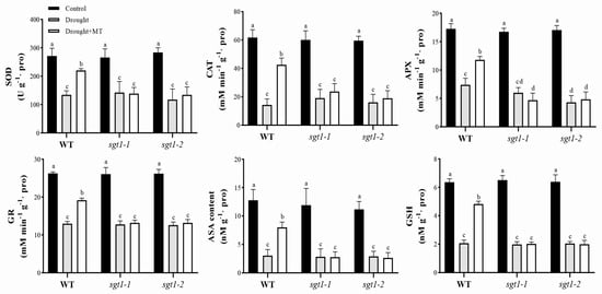 Effects of melatonin treatments on the antioxidant activity under drought stress. Activities of superoxide dismutase (SOD), catalase (CAT), ascorbate (APX), and glutathione reductase (GR), as well as the ascorbic acid (ASA) and glutathione (GSH) contents, were examined in the leaves of wild-type (WT) and sgt1 mutant seedlings treated with melatonin (MT; 100 μM) under drought stress. Difference in letters indicates significant differences according to Tukey’s Multiple Comparison Test (p < 0.05).