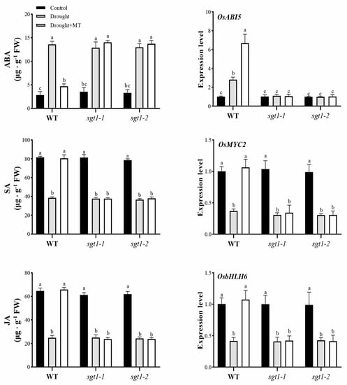 Expressions of ABA-, JA- and SA-associated signalling genes were also investigated, including abscisic acid insensitive 5 (OsABI5), basic helix-Loop-helix protein 6 (OsbHLH6), and myelocytomatosis oncogene transcription factor 2 (OsMYC2). Consequently, upregulated OsABI5 expression and downregulated expression of OsbHLH6 and OsMYC2 were detected in WT under drought stress. The treatment of MT led to a restored expression of all three investigated genes even under conditions of drought stress (Figure 4). Specifically, MT-induced OsABI5 expression was even higher than under-drought stress, where no significant difference in the expression of OsABI5, OsMYC2, and OsbHLH6 was detected in sgt1-1 and sgt1-2 mutants, irrespective of MT treatment (Figure 4). All these results indicated that the mutation of OsSGT1 had significant effects on the interrelationship of MT with other phytohormones under drought stress.