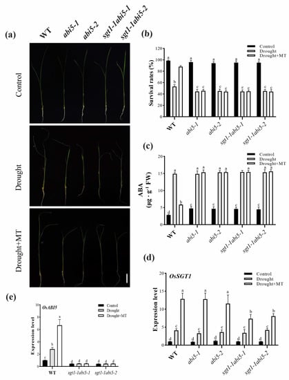 Moreover, under drought stress, OsSGT1 showed higher expression levels than CK and even reached the highest expression levels after MT treatment, despite showing no significant difference in WT, abi5, and sgt1-1abi5 seedlings (Figure 5d). However, in sgt1-1abi5-1 and sgt1-1abi5-2 mutants, there was no significant change in OsABI5 expression levels detected under drought stress, even after melatonin treatments (Figure 5e). These results suggested that mutations of OsABI5 and OsSGT1 affected the alleviating effects of melatonin on drought stress.