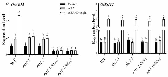 Effects of exogenous ABA on the expression levels of OsABI5 and OsSGT1. Expression levels of OsABI5 and OsSGT1 were examined in the leaves of wild-type (WT), abi5, sgt1-1abi5 and sgt1 mutant seedlings treated with exogenous ABA (10 μM) under drought stress. Difference in letters indicates significant differences according to Tukey’s Multiple Comparison Test (p < 0.05).