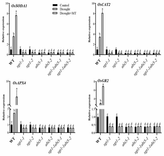 Expression of antioxidant responsive genes, including superoxide dismutase A1 (OsSODA1), peroxisomal ascorbate peroxidase 4 (OsAPX4), glutathione reductase 2 (OsGR2), and catalase 2 (OsCAT2), were further investigated to confirm the effects of OsSGT1 and OsABI5 on the antioxidant system. Compared with CK, in WT, expressions of the four investigated genes were significantly upregulated under drought stress while becoming even higher after melatonin treatment (Figure 7). In sharp contrast to WT, drought stress greatly down-regulated the expression of OsSODA1, OsCAT2, OsAPX4 and OsGR2 in sgt1-1 and sgt1-2 mutants, irrespective of MT treatment (Figure 7). Moreover, in abi5 mutants, as wells as the dual mutants of sgt1-1abi5, there was no significant difference in the expression level of these genes, irrespective of the drought stress and melatonin treatment (Figure 7). These results indicated that the effects of OsSGT1 and OsABI5 on the antioxidant system were tightly associated with the expression of antioxidant responsive genes, i.e., OsSODA1, OsCAT2, OsAPX4 and OsGR2.