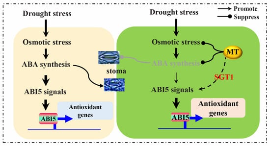 The studies conducted so far on the potential of melatonin to alleviate drought stress mainly focused on the improved photosystem capacity [] and the enhanced antioxidants for ROS scavenging in various species []. For example, enhanced efficiency of photosystem II and increased photosynthesis after foliar spraying with MT have been found in several cereal crops, such as wheat [], soybean [,], and maize []. Besides, reduced ROS accumulation via a regulated antioxidant system serves as another key indicator to explain the mitigating effects of melatonin on drought stress [,]. Aside from these effects, phytohormone-mediated signals were also usually thought to be responsible for the melatonin-alleviated effects on drought stress. Melatonin cross talks with other plant hormones, i.e., indole-3-acetic acid (IAA), ABA, gibberellins (GA), jasmonic acid (JA), and salicylic acid (SA), to drive system-acquired response to various stresses [,,]. Among them, ABA has been widely reported to serve as one vital signalling molecule under drouth stress conditions in many plants, whose effect is largely associated with the enhanced antioxidant system [,]. Interestingly, melatonin antagonistically interacts with ABA to alleviate drought stress [,] while promoting the synthesis of other hormones, i.e., SA, JA, even under drought stress [,].