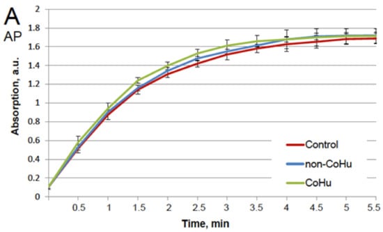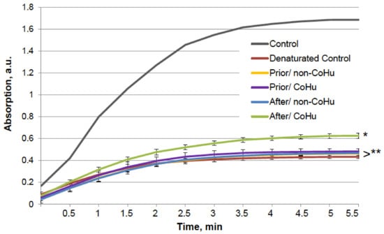 The same type of test was performed with alkaline phosphatase. Heating of alkaline phosphatase resulted in a 7-fold loss of its activity. However, Figure 3 shows that treatment of inactivated enzyme samples with CoHu after inactivation had the most remarkable restoring effect. The activity of the enzyme in all other samples that were treated with CoHu was also higher than in heat-inactivated controls that had only 14% of the activity of intact enzyme (ref. Figure 1A). The mean increase in alkaline phosphatase activity in the end of the reaction in samples treated with CoHu after inactivation was 130% in the last point of the measurement compared to inactivated control, which was 32% of the activity of intact enzyme. Optical density of the product of the reaction in samples that were treated with CoHu before heating differs from inactivated control (p = 0.032). However, there is no significant difference between samples treated with non-CoHu.
