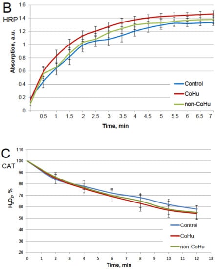 Our first task was to find out whether CoHu has any effect upon normally functioning (non-inactivated) enzymes. For that purpose, all enzyme samples were divided in 3 groups as shown in the legend. The data presented in Figure 1A show the effect of CoHu on normally functioning alkaline phosphatase, Figure 1B—horseradish peroxidase and Figure 1C—the effect of CoHu on intact catalase. For catalase (C), residual quantity of H2O2 (catalase substrate) in the catalase-assisted degradation reaction is shown, which reflects the activity of the enzyme. The figure shows that CoHu does not have any significant impact on undamaged enzyme activity. Data from this figure will be used as intact enzyme control in other experiments.