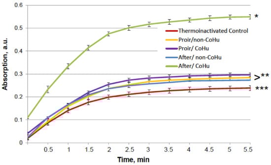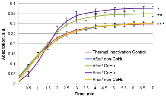 The results for HRP are presented in Figure 2. After heating the activity of HRP decreased 4.5 times compared to intact enzyme, the mean of 0.308 a.u. against 1.360 a.u (Figure 1B). Samples treated with CoHu before and after inactivation had higher activity than the rest of the samples. Moreover, treatment of the enzyme before inactivation had a stronger effect than after, which indicates a possible protective effect. The mean increase in peroxidase activity in the end of the reaction in samples treated with CoHu before and after inactivation was 24.9% and 14.9%, respectively, compared to inactivated control. In Figure 2 the p value between the end points marked with * and *** is 0.0287, between * and ** p is 0.0485, and between ** and *** p is 0.0366.