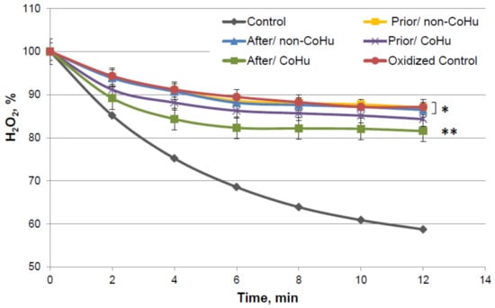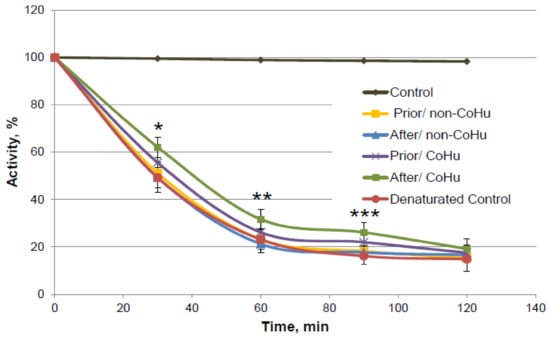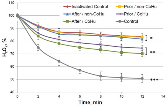 Catalase activity based on the residual quantity of H2O2 (catalase substrate) in the catalase-assisted degradation reaction. Control—activity of intact enzyme. Prior/non-CoHu—activity in samples that were treated with non-CoHu before inactivation. After/CoHu—activity in samples that were treated with CoHu after inactivation. Prior/CoHu—activity in samples that were treated with CoHu before inactivation. In time points marked as *, ** and *** there is reliable difference between the groups (p < 0.05).