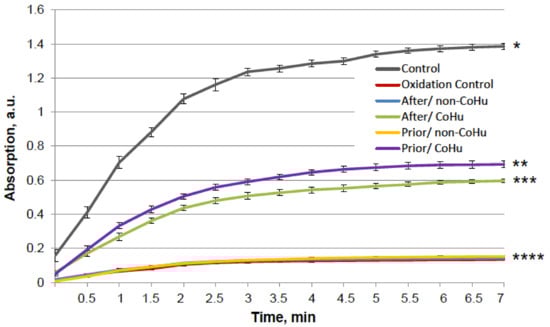 In Figure 6, it is shown that treatment with CoHu before and after oxidation had a notable protective effect on the activity of alkaline phosphatase. Only 6.4% of alkaline phosphatase activity remained after oxidation in oxidized control samples (red line). Treatment with non-CoHu led to a slight increase of activity. Treatment with CoHu after inactivation helped to restore 19.8% of the intact enzyme activity (309% of oxidized control), while treatment before oxidation partially protected the enzyme and saved a mean of 18.1% of intact enzyme activity (282% of oxidized control). In Figure 6 the p value between lines marked with * and ** is 0.0481, between lines marked with ** and **** p is 0.0187, and between lines marked with *** and **** p is 0.0494. In Figure 6 the activity of the intact enzyme control is not shown to pay more attention to the details in the activity of inactivated samples. The control activity values can be found in Figure 1A.