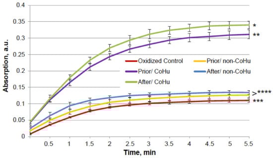 The effect of CoHu on oxidized HRP. Data presented as mean arbitrary units of 10 measurements ± SD. Prior/non-CoHu means that samples were treated with non-CoHu before inactivation. After/CoHu means that samples were treated with CoHu after inactivation. Prior/CoHu means that samples were treated with CoHu before inactivation. *, **, *** and ****—Lines with different superscripts differ significantly (p < 0.05).