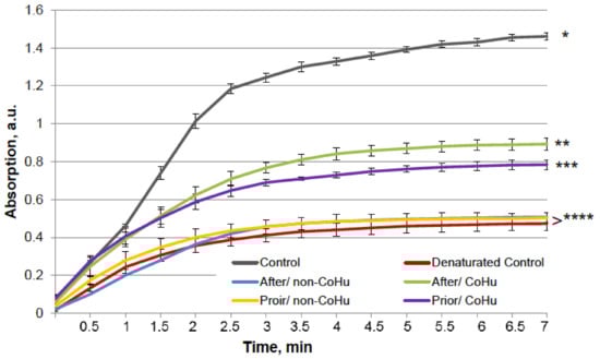 The results for HRP are presented in Figure 8. The grey line represents normal HRP activity as a control. After the unfolding, 32.2% of HRP activity remained (red line). Treatment with non-CoHu did not differ from denatured controls. A restoring effect was observed in response to the use of CoHu both before (53.4% of intact enzyme activity and 166% of denatured control) and after unfolding (60.9% of intact enzyme activity and 189% of denatured control). Therefore, treatment after denaturation had a greater impact. In Figure 9 the p value between lines marked with ** and *** is 0.0297, between lines marked with *** and **** p is 0.0213, and between lines marked with * and ** p is 0.0076.