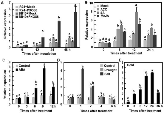 - Yamamoto, T.; Yoshida, Y.; Nakajima, K.; Tominaga, M.; Gyohda, A.; Suzuki, H.; Okamoto, T.; Nishimura, T.; Yokotani, N.; Minami, E.; et al. Expression of RSOsPR10 in rice roots is antagonistically regulated by jasmonate/ethylene and salicylic acid via the activator OsERF87 and the repressor OsWRKY76, respectively. Plant Direct 2018, 2, e00049. [Google Scholar] [CrossRef] [Green Version]