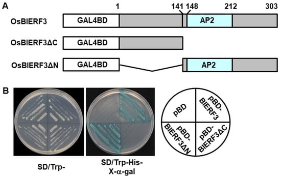 2.2. OsBIERF3 Is a Transcriptional Activator