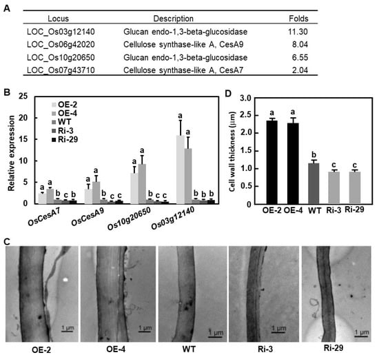 2.7. Altered Expression of OsBIERF3 Affected Cell Wall Thickness