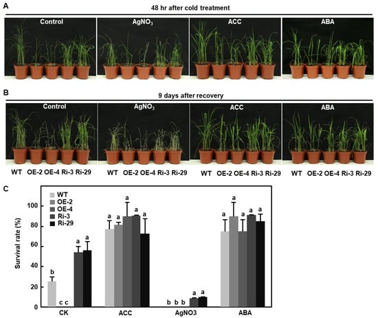 2.9. Involvement of ET and ABA in OsBIERF3-Mediated Cold Response in Rice