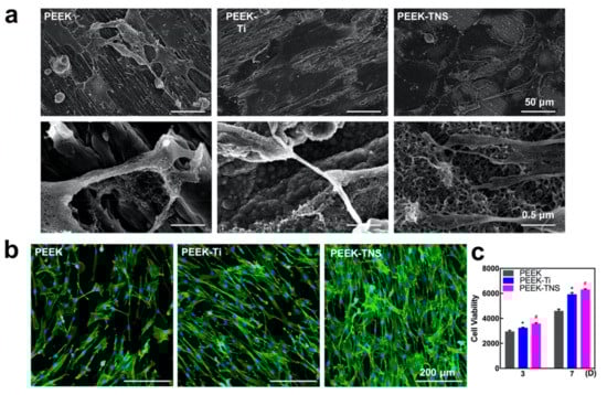RBMMSC attachment and proliferation of the samples were analyzed after incubation for 24 h. As shown in Figure 5a, the cells on the PEEK surface exhibited few pseudopodia extensions. The cells cultured on the PEEK-Ti surface extended farther but still attached poorly to the samples with short pseudopodia extensions. However, the cells on the PEEK-TNS surfaces stretched and stacked with a polygonal geometry, as well as exhibited long filopodia, indicating a close connection to the nanopores of the surface. Figure 5b illustrates the images of actin cytoskeletal organization (green, labeled with Alexa Fluor® 488 Phalloidin) and nuclei morphology (blue, stained by DAPI dye solution) of rBMMSCs adhering to the various samples. Cells on the PEEK-TNS surface occupied nearly the entire substrate surface and exhibited several filopodia and lamellipodia with abundant pseudopods to interconnect with each other. The cell proliferation was measured using Cell Titer Blue, as shown in Figure 5c. The PEEK-TNS groups exhibited significantly higher cell proliferation than the PEEK-Ti and PEEK groups. This was consistent with the observations from confocal laser scanning microscopy (CLSM).