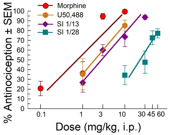 Following administration through the intraperitoneal (i.p.) route, SI 1/28 dose dependently increased antinociception in the acetic acid writhing test with an ED50 (and 95% C.I) value of 27.4 (16.0–43.7) mg/kg, i.p. (Figure 1). These effects were significantly less potent (F(2, 107) = 21.18, p < 0.0001; nonlinear regression modeling) than the effects of the parent compound SI 1/13 (ED50 (and 95% C.I.) value of 2.67 (1.34–4.27) mg/kg, i.p; Figure 1), the nonselective opioid positive control, morphine (ED50 (and 95% C.I.) value of 0.74 (0.40–1.21) mg/kg, i.p; Figure 1) and known kappa opioid receptor (KOR) agonist, U50,488, with an ED50 (and 95% C.I.) value of 2.22 (0.63–5.08) mg/kg, i.p. (Figure 1).
