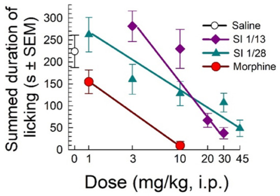 Inflammatory antinociception was evaluated with the use of the formalin assay in C57BL/6J mice as previously described [64]. SI 1/28 (1–45 mg/kg), SI 1/13 (3–30 mg/kg), morphine (1 and 10 mg/kg), or saline (0.9%) were administered as a 10 min. pretreatment prior to an intraplantar (i.pl.) injection of 5% formalin (2.5 μg in 15 μL) administered into the right hind paw. Time spent licking the right hind paw was recorded in 5 min intervals for 60 min following injection. The last 55 min of assessment was used to determine inflammatory response stimulus. Data were analyzed as area under the curve (AUC), representing summed time mice spent licking the right hind paw.