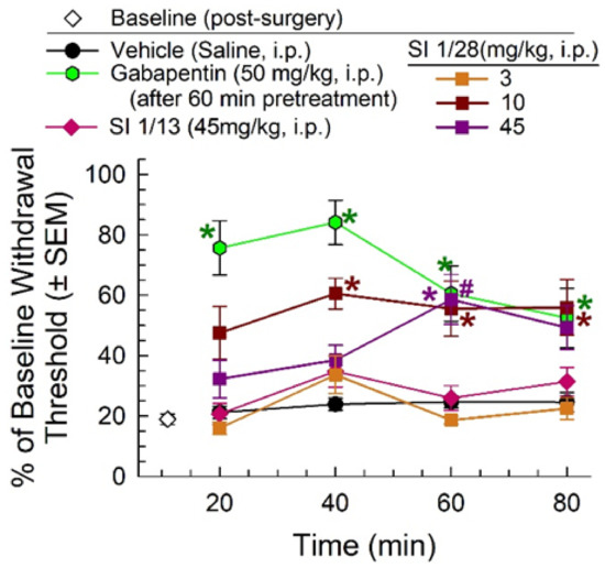 Dose- and time-dependent anti-allodynic activity of SI 1/28 (squares) in the mouse CCI assay of neuropathic pain. Mechanical allodynia produced from sciatic nerve ligation was reduced from 40–80 min (10 mg/kg, i.p., red squares) and 60–80 min (45 mg/kg, i.p.; purple squares), similar to the effect of the positive control, gabapentin (green hexagon). SI 1/28 (45 mg/kg, i.p.; purple squares) was significantly increased compared to the parent compound, SI 1/13 (pink diamonds). n = 8–17 for all groups. * = significantly different from vehicle controls; # = significantly different from SI 1/13; p < 0.05; two-way RM ANOVA.