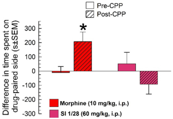 Automated, three-compartment place preference chambers were used to evaluate CPP in C57BL/6J mice. A 2day counterbalanced conditioning design [70] was employed with initial place preference evaluation being tested 24 h prior to place conditioning. In initial preference testing, the mice were allowed free access to all compartments of the apparatus for 30 min and total time spent in each compartment was recorded. For 2 days following initial preference evaluation, the mice were administered vehicle (5% DMSO and 95% saline) then confined into an outer compartment of the apparatus for 40 min. Four h after saline administration, the mice were administered (i.p.) either morphine (10 mg/kg) or SI 1/28 (60 mg/kg) then confined in the opposite outer compartment for 40 min. Conditioning restrictions were repeated precisely on day 2 of place conditioning. 24 h after the second day of conditioning, final place preference was evaluated. Mice were allowed to roam freely between all chambers for 30 min. Data are expressed as the difference in time spent in the drug-paired and vehicle-paired compartments. Positive values represent conditioned preference, whereas negative values are considered conditioned aversion for the drug-paired side.