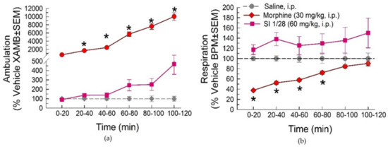 Dose- and time-dependent (a) spontaneous ambulation and (b) respiratory effects of morphine (30 mg/kg, i.p.; red circles) or SI 1/28 (60 mg/kg, i.p.; pink squares) evaluated in the CLAMS/Oxymax system with C57BL6/J mice. * = significantly greater than vehicle effect (gray dashed line), p < 0.05; two-way ANOVA w/Dunnett’s post hoc test. n = 12 mice/group. Data presentenced as % vehicle response ± SEM; ambulation, XAMB (a) or breaths per minute, BPM (b).