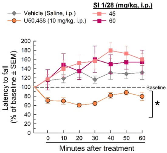 Dose- and time-dependent effects of SI 1/28 (squares) after 45 and 60 mg/kg i.p. administration in the mouse rotarod assay. U50,488 (10 mg/kg, i.p; orange circles.) is the positive control. * = significantly different than vehicle (0.9% saline; gray diamonds), p < 0.05; two-way ANOVA w/Dunnett’s post hoc test; n = 8–12 mice/treatment.